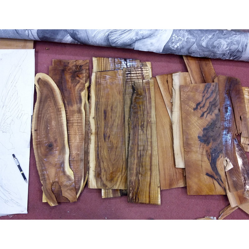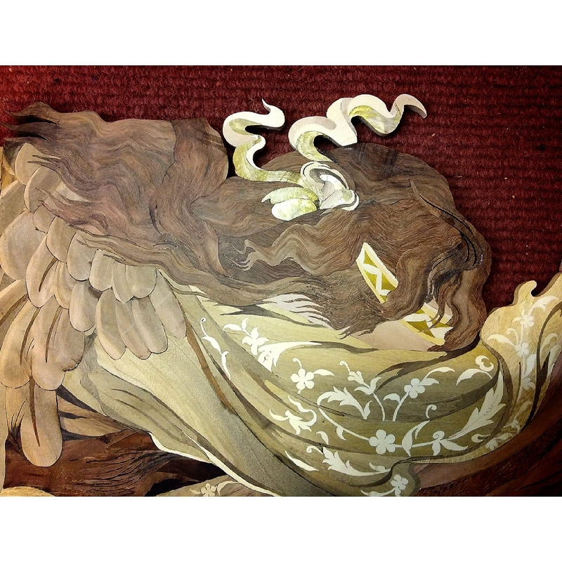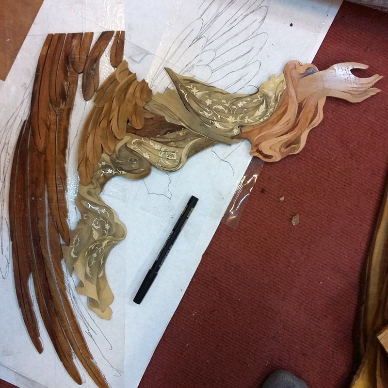 لصُنع الشکل الدقیق و المائج لشعر الملاك، بدلاً من اتباع الطریقة التقلیدیة و وضع الخطوط المختلفة علیها (التي تؤدي إلی تلف النقوش و نسج الخشب و بالنتیجة تُقلِّلُ من عمرها)، قمنا بدمج الأنسجة الطبیعیة لخشب شجرة “کویرة” في الإتجاه المعني و في هذه الحالة لم یتعرض شکل و مظهر الشعر إلی القطع بل یظهر بواسطة الشکل الطبیعي للخشب. و لقد استخدمنا هذه الطریقة الفریدة في صُنع أجنحة الملاك و بعض الأقسام الأخری من اللوحة أیضا.