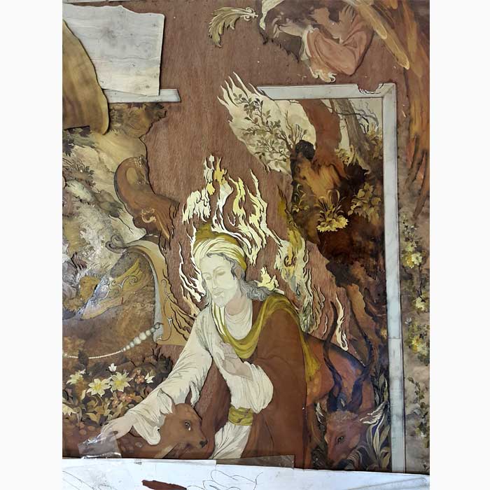 صنع الصخرة و دمج الشجیرات و الأشجار في جوفها من المظاهر الفریدة في استخدام الخشب في هذه اللوحة و یُعتبر منهجاً جدیدا و إبداعاً في فن المعرّق من ناحیة استخدام الخشب.